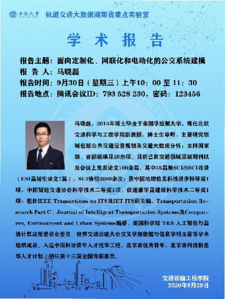 2020年9月30日上午10时,北京航空航天大学交通科学与工程公司马晓磊副教授接受bv伟德国际1946王璞教授邀请,于线上举办主题为“面向定制化、网联化和电动化的公交系统建模”的学术报告,公司陈维亚副经理,交通运输系徐光明...