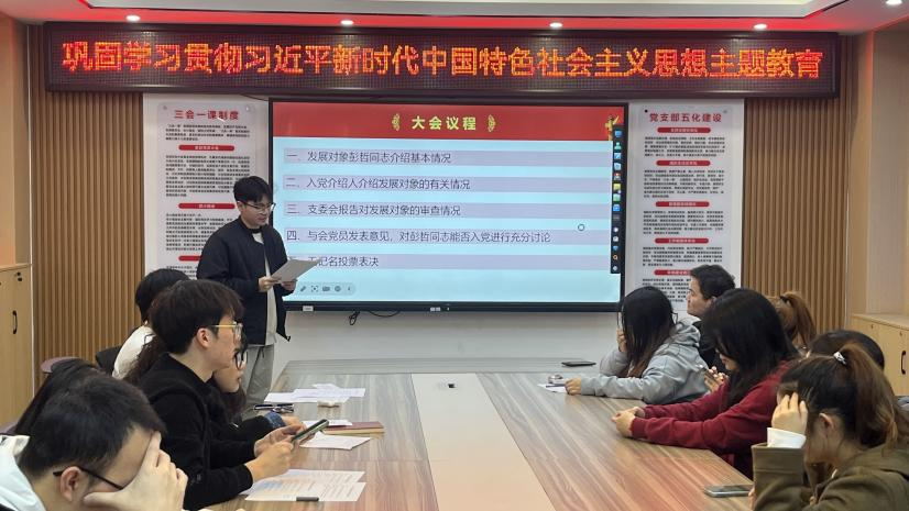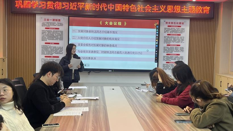 最后,经过大会的讨论,支部书记宣读表决决议,党支部同意接收彭哲同志、谢姝洁同志、舒靖瑶同志为中共预备党员。支部书记陈灏同志对三位新党员的加入表示了热烈欢迎和衷心祝贺,并勉励他们继续加强学习,不断提高政治素质和业务能力,以实际行动践行党的宗旨和誓言。