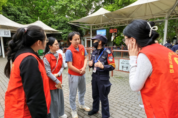 到达活动地点后,成员们在游客中心有序签到并领取志愿者红马甲。随后,工作人员对成员们进行了分组,支部成员们被分配到了地铁二号线出口、行李寄存柜旁、游客中心内、景区扫码入园处等多个关键服务站点。正值周末,每个站点均游客流量巨大、服务需求集中。在正式上岗前,成员们接受了简单的培训,熟悉了各自岗位的工作内容和要求。他们认真听讲、积极提问,确保能够迅速进入角色,力所能及地为游客服务。