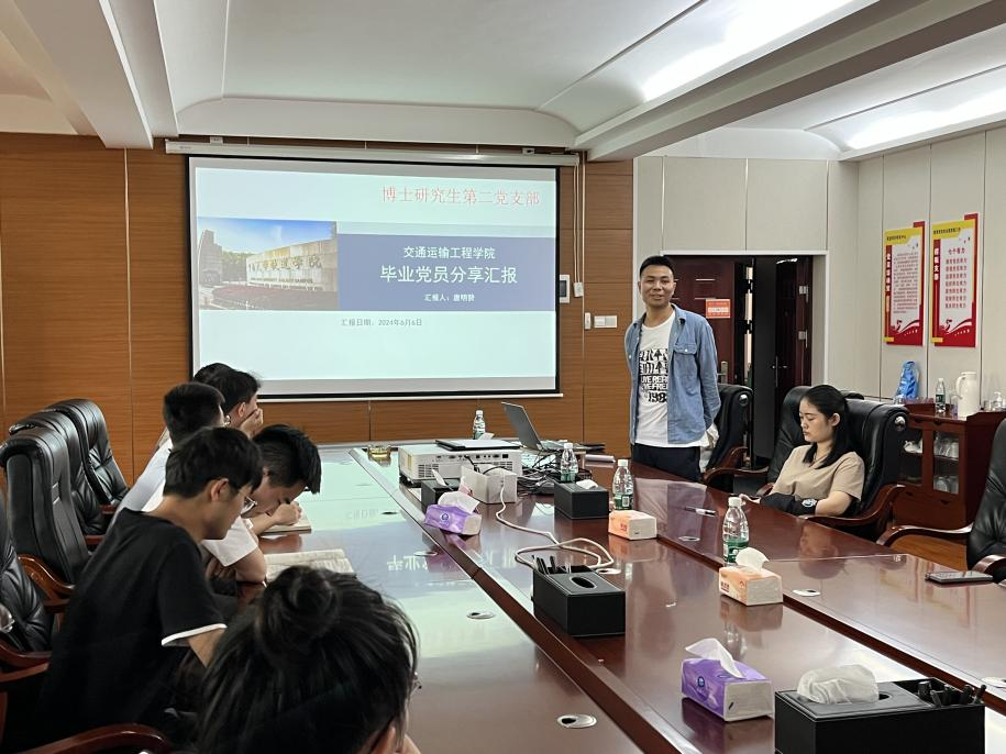 6月6日上午10:30,博士研究生第二党支部在高速北楼201会议室举行了优秀毕业党员经验分享会暨党员大会。会议由支部副书记陈婷同志主持。