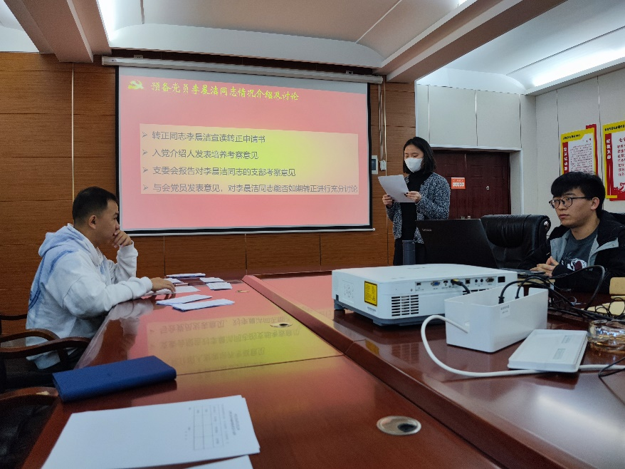 预备党员接收大会后,举行了预备党员转正大会。李晨洁、邓敏、杨宇博三位同志依次宣读转正申请书,汇报了预备期间的思想变化、学习和工作情况,同时反思了过去一年不足和并提出了改进措施,表明了成为正式党员的坚定决心和积极态度。