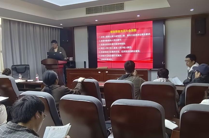 会议伊始,郑繁简同志对会议流程进行简要介绍,随后杨宇航、肖逸、江居翰、李大宇、张钟月、王健达六位发展对象依次上台宣读《入党志愿书》,从党的历史,党的性质,党的最高理想与目标等方面谈自己对党的认识,并从思想、学习、工作、生活等维度汇报自己的基本情况与入党动机。之后付逸鹏和路佳同志代表支部宣读政治审查报告,关剑祺和彭程同志作为入党介绍人依次宣读了每位发展对象同志的入党介绍人意见,紧接着,与会党员同志对六位发展对象同志发表个人评价意见。