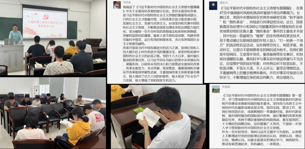 精读党的理论著作,学习党的理论知识,是我党加强的理论知识学习的优良传统。在本次主题教育中,博士研究生第四党支部举行了《习近平新时代中国特色社会主义思想专题摘编》集中学习活动,并于5月9日下午16:30在交通楼515进行线下交流分享活动。党员同志们依次结合书籍内容将自己的学习心得分享给支部全体党员,共同促进对习近平新时代中国特色社会主义思想的学习。