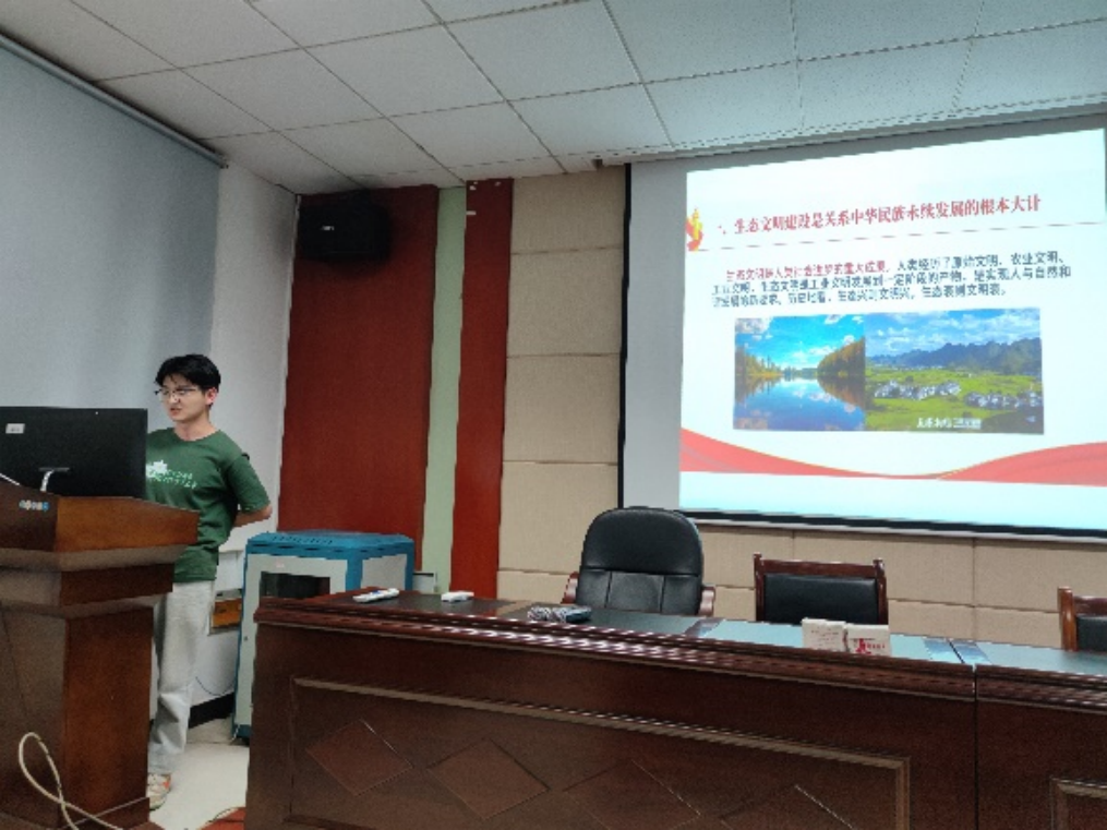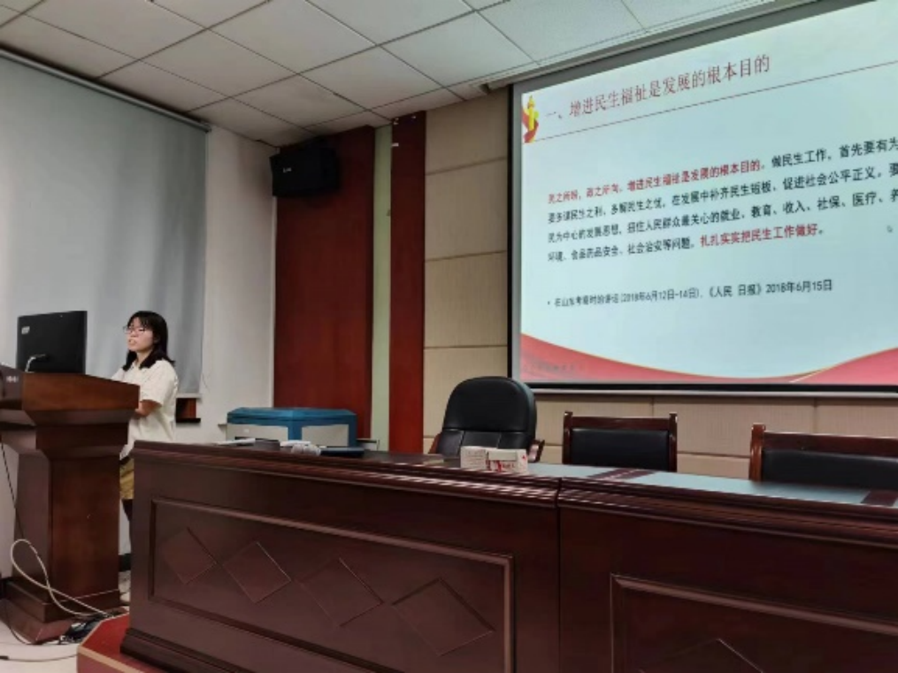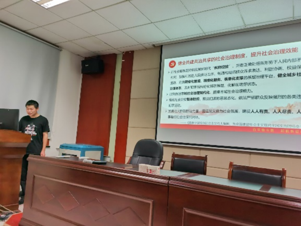 五位支委依次上台,向全体党员讲述主题党课。首先李茜同志以“坚持在发展中保障和改善民生”为主题分享道:增进民生福祉是发展的根本目的,分配制度是促进共同富裕的基础性制度,就业是最基本的民生,社会保障体系是人民生活的安全网和社会运行的稳定器,人民健康是民族昌盛和国家强盛的重要标志。孙光宇同志围绕“坚持人与自然和谐共生”从生态文明建设的必要性、重要性与具体措施出发,循序渐进,逻辑严谨,图文并茂地讲述了生态文明建设的相关理论知识。随后,颜亚超同志进行了“坚决维护国家安全和社会稳定”的主题党课分享,他表示,统筹发展和安全是我们党治国理政的一个重大原则,我们要坚定不移贯彻总体国家安全观。余晨同志从听党指挥、能打胜仗、作风优良,党对人民军队的绝对领导,全面提高新时代备战打仗能力,全面推进国防和军队现代化,构建一体化的国家战略体系和能力五个方面,与大家分享了习近平新时代中国特色社会主义思想关于“把人民军队建设成为世界一流军队”的内容。最后苌艳路同志以“坚持和完善‘一国两制’,推进祖国统一”为主题分享了“一国两制”是香港、澳门回归后保持长期繁荣稳定的最佳制度安排,坚持依法治港治澳,推动“一国两制”实践行稳致远和牢牢把握两岸关系主导权和主动权,坚定不移推进祖国统一大业三个方面的内容。