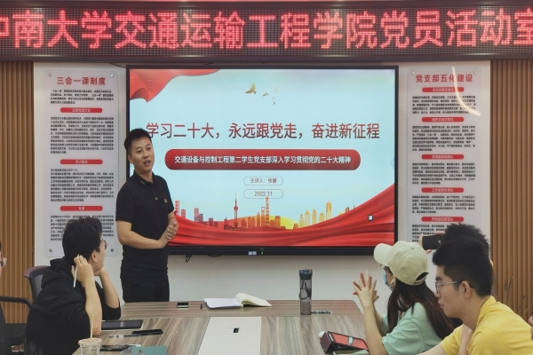 11月12日上午9:00,交通设备与控制工程第二员工党支部于铁道校区第一综合实验楼党员活动室集中学习党的二十大精神。此次会议由支部副书记曾炜强同志主持。会议通过红色影片赏析、党的二十大知识竞赛、党支部书记讲党课等形式,普及党的理论知识,增强党员党性修养。
