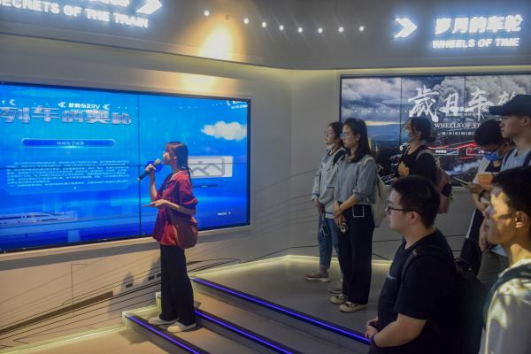 最后,志愿者以“时代的车轮”为主题在先进轨道交通科普馆为大家进行讲解。通过讲解,同学们了解了交通院的发展历程,铁路票务系统的发展历史、地铁车站客运组织及其模拟人流管控和机车车辆的分类,身临其境地感受到轨道交通的魅力,也领会到交通强国梦想的实现离不开广大铁路工作者的无私奉献和艰苦奋斗。