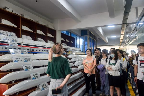 首先,同学们来到本次参观的第一站——实车碰撞实验室。志愿者为同学们介绍了实验室的主要器材和设备及其具体功能。接着,志愿者根据材料、结构等不同方面对碰撞实验的影响说明碰撞装置在高铁上的三个创新性功能以及碰撞吸能科研成果在高铁上的应用。介绍完毕后,志愿者继续带领学员们了解复兴号不断转型升级、增值提效的发展历程。随着工匠们精益求精、不断钻研,列车性能逐步优化,展现了中国铁路人砥砺奋进、不断创新的伟大精神。