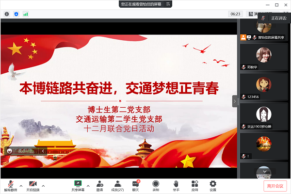 1月5日晚上20:00,交通运输第二员工党支部、博士研究生第二党支部联合于线上举行“本博链路共奋进,交通梦想正青春”党日活动。本次活动面向全院本科生,有来自四个年级的70余名同学参加,活动由曾怡佳同志主持。