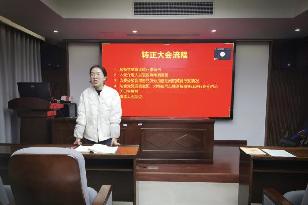 会议最后,支部书记石晓琪同志进行总结发言。首先,她对所有转正同志表示祝贺。其次,她提到,希望三位转正的同志今后能够以一名优秀党员的身份严格要求自己,牢记吃苦在前、享乐在后,在各个方面发挥出先锋模范作用。