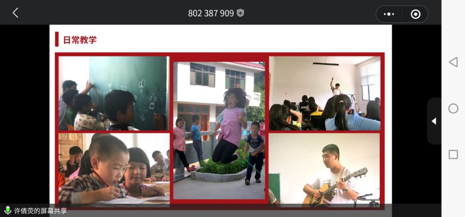 在分享支教故事时,苌艳路同学着重分享了他在湘西支教的经历。 “志愿精神如同太阳,穿越人海。”当他提到孩子们渴求知识的眼神、纯真的笑脸、湘西的美景时,所有人都感受到了他帮助山区孩子时的快乐与满足。此外,许倩荧同学带来了她与归于书院的故事。在这个故事里,“文化保护”成为了一个大主题,滩头年画、花瑶拦门酒、炭花舞......它们承载着邵阳市隆回县小江边村的历史。许同学这样说:“传承文化,志愿者先行,你我义不容辞。”