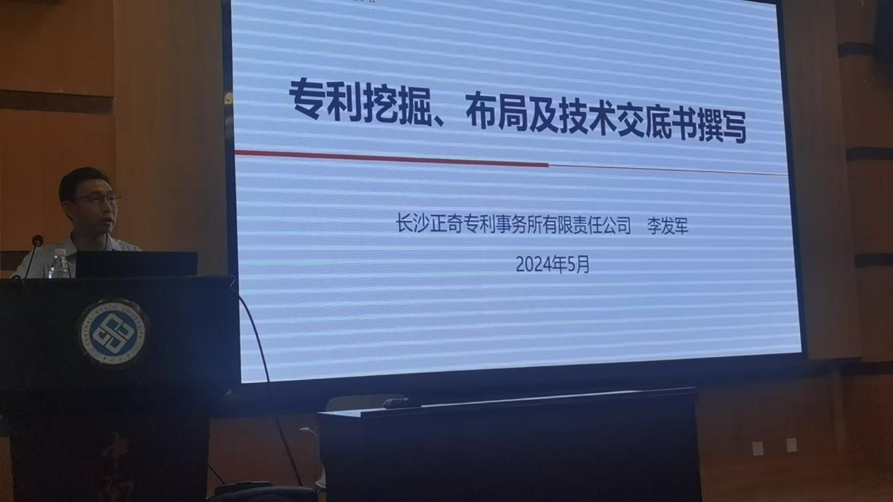 讲座上,李发军所长介绍了长沙正奇专利事务所的基本情况,并从“专利的基本概念”“专利的申请流程”“怎样挖掘和布局专利”“技术交底书撰写技巧”四个方面出发,结合自身的经历和经验为同学们给予和提出专利申请相关的指导和建议。李所长对专利申请是否提前公开、是否提前实质审查、是否延迟审查的利弊一一做了分析,依照委托申请国内专利信息表介绍了专利申请的流程。