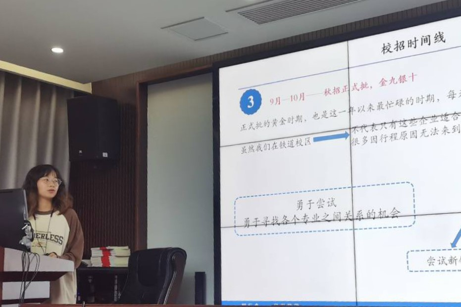 崔云平同学分享结束后,赵惠娴同学围绕“就业前期准备——信息收集”展示了校招时间线:5月至6月底各大企业会发布实习信息;7月至8月底企业提前批岗位集中发布,这是同学们第一次接触企业、了解岗位的机会,同学们可以借此锻炼胆量和语言能力并积累面试经验;9月至10月是秋招正式批的黄金时期。赵惠娴同学鼓励同学们积极寻找专业和不同岗位的关联点,大胆尝试,抓住机会,并以自身专业为例指出了轨道交通信号与控制专业的各种去向。然后,赵惠娴同学分享了多种就业信息收集方式和渠道,如bv伟德国际1946就业信息网、bv伟德国际1946就业指导中心公众号、企业招聘官网、offershow小程序、脉脉APP等,希望能帮助同学们合理有效地收集和了解企业校招的最新消息。