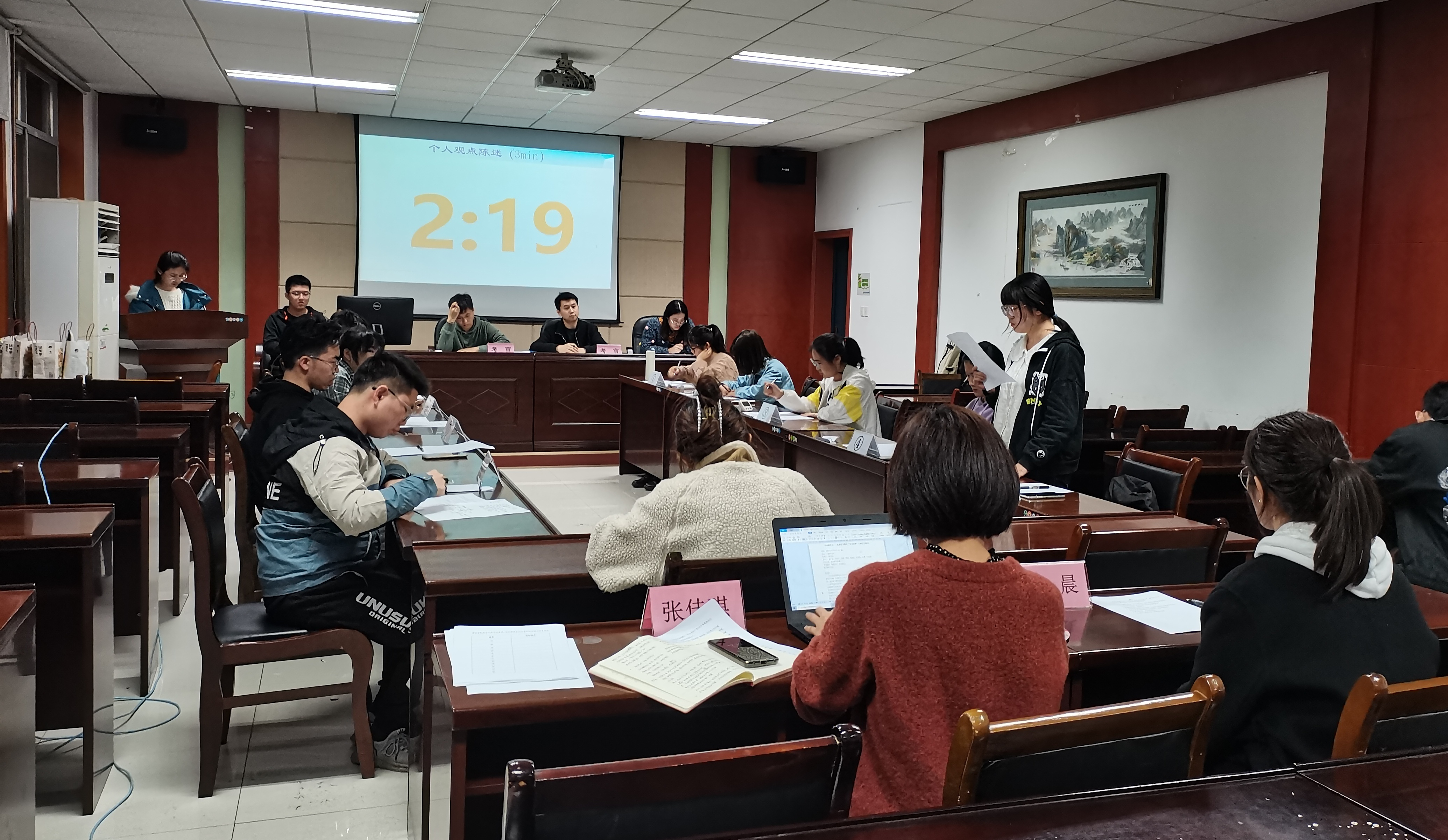 11名参赛选手。比赛开始后,各选手按抽签顺序依次进行1分钟的自我介绍,随后开始陈述个人观点,进行30分钟自由交叉讨论并完成小组总结陈词。在讨论过程中大家发言积极,清晰地表达出自己的意见和看法,并且仔细倾听他人意见,为小组讨论贡献自己的力量。讨论氛围十分热烈。随着讨论的深入,选手们的意见逐渐达成一致,一致推选6号选手代表小组做总结陈词。总结之后,由各位评委就选手们讨论中的观点、表现进行提问,并对选手们的表现进行整体复盘和点评。