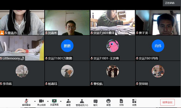 自新冠病毒肺炎疫情爆发以来,交通运输T1801班的同学们不仅能够保护自身安全,还能自觉、主动地完成线上课程的任务,并在学习群中及时交流自己的问题。除此之外,班长和学委还积极响应公司知新馆的号召,借助腾讯会议开展班级线上“云自习”,帮助同学们提高居家学习的效率,为同学们提供共同学习进步的平台。