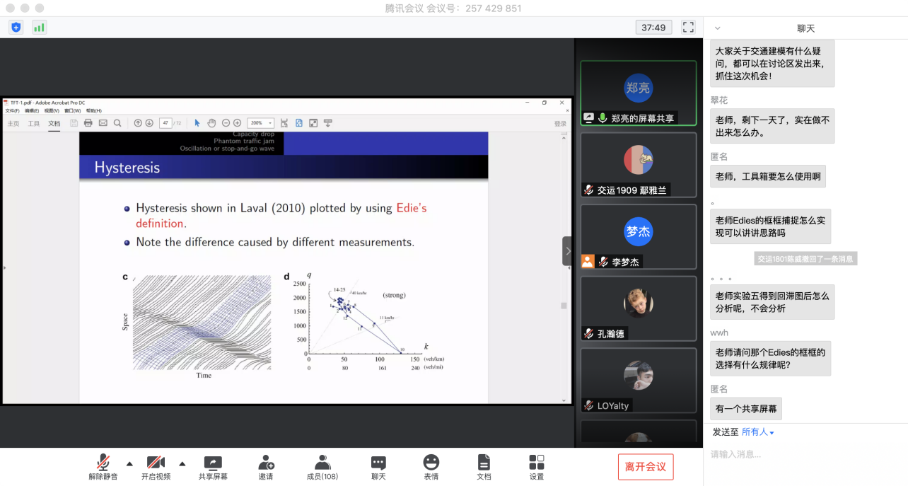 首先,郑亮老师为同学们分析了学习交通数学建模的意义,以及参加数模竞赛需要具备的技能。接着,郑亮老师就同学们对于交通建模存在的疑问进行了解答,依次分析了时间序列、灰色预测等几种交通预测方法、MATLAB工具箱的运用,以及如何利用edie的定义对时空轨迹图进行数据提取。
