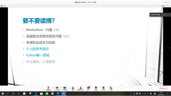 首先,bv伟德国际1946物流工程专业2017届毕业生、现于复旦大学管理公司产业经济学攻读博士的张明同学根据自己的研究方向和兴趣就要不要读博、读博时如何择校和择导师、读博的能力要求以及博士生就业等方面为大家解答疑惑。张明同学表示,最好不要以逃避就业与其他现实问题作为读博的动机,而是要以兴趣为动机。同学们既要综合分析机会成本与风险、专业基础和心理素质等方面来选择是否要读博,也要根据自己的学术定位和领域来确定自己是否适合读博。