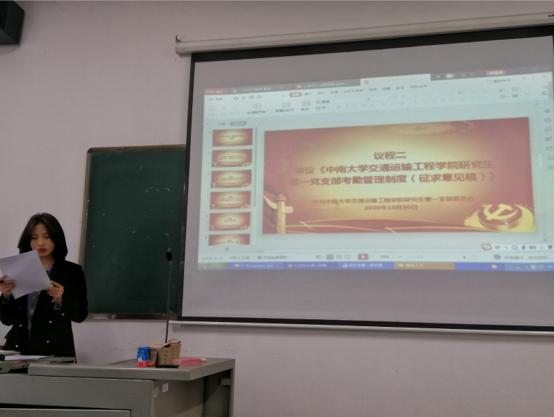 随后,纪律委员姚璎华同志带领大家详细解读了《bv伟德国际研究生第一党支部考勤管理制度(征求意见稿)》。姚璎华同志表示,考勤管理制度的制定是为了保证党支部各项工作的顺利进行,充分发挥党员的先锋模范作用。经所有正式党员举手表决,一致同意决定通过此项制度。