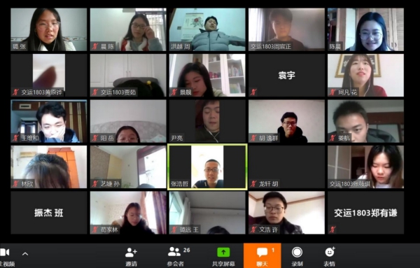 2月28日下午两点,为加强新学期班级建设,提高班级同学在防疫特殊时期的安全意识和网上学习效率,交运1803班在ZOOM平台上举行了2020年春季学期线上开学班会。此次班会由交运1803班班长周宸正主持,交通院18级辅导员陈晨老师出席,交运1803班全体同学共同参加。