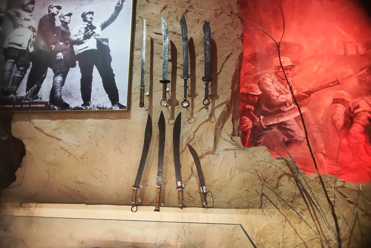 展柜中摆放着曾经的步枪、大刀,课本中的小米加步枪在成员们心中变得更为具象。缝补的布衣和军大衣让成员们进一步感受到当年的艰辛时光。纪念馆以翔实的资料、丰富的形式为载体直观地向成员们传达着光荣的革命传统。