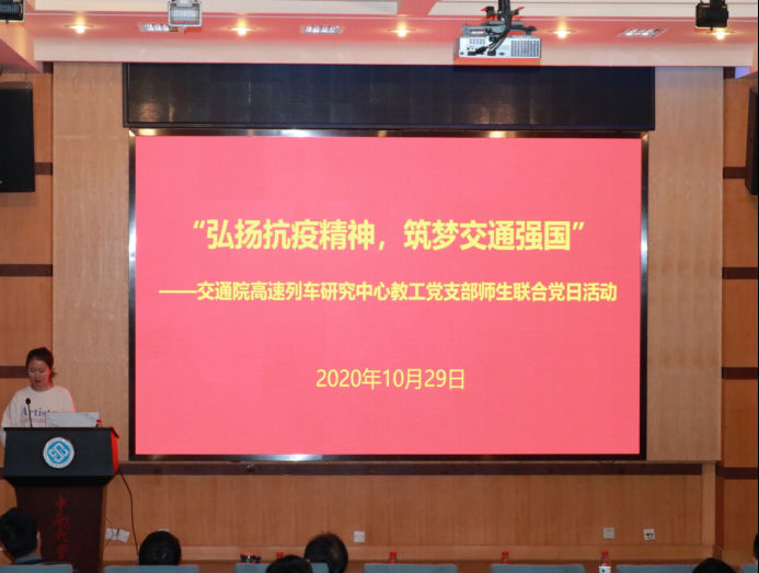 为了发挥“全国党建工作样板支部”的带头作用,加强党支部建设,发挥党员先锋模范作用,促进公司人才培养工作在公司党委的领导下10月29日晚上六点半交通院高速列车研究中心教工党支部联合公司博士、硕士和本科生5个员工党支部在铁道校区国际报告厅开展“弘扬抗疫精神,筑梦交通强国”主题党日活动铁道校区关工委常务副主任张国强公司党委副书记宋晓东、党委委员韩锟副经理、彭勇副经理,全体党支部书记、各支部党员、发展对象、入党积极分子160余人参加本次活动,现场座无虚席。本次活动交通设备与控制工程第二员工党支部书记任琭同志主持。
