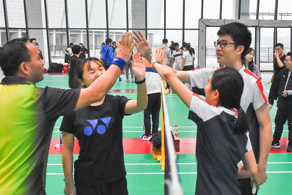 在上午进行的小组赛中,交通院师生代表队出师大捷,先后击败自动化院和资生院,率先拿下2个大比分。在下午的小组赛中,交通院师生代表队渐入佳境,火力全开,以气贯长虹的气势战胜了公管院、学工部、湘雅医院、国际教育公司和化工院。值得一提的是,在对战国际教育公司时,在男双遗憾失分的情况下,女双和混双顶住压力,扭转局势,在混双的第二局中更是打出了11:0的碾压战绩,最终交通院以全胜战绩小组第一晋级八强。