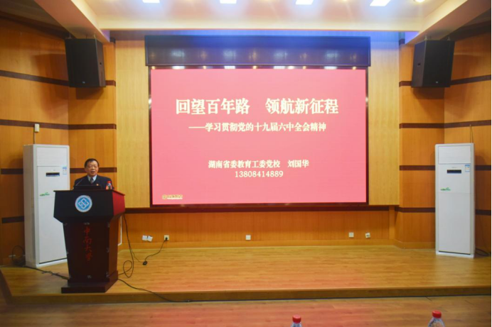12月15日下午14:30,为深入学习宣传贯彻党的十九届六中全会精神,引导广大师生把思想和行动统一到全会精神上来,bv伟德国际1946以国际报告厅为主会场举行“党的十九届六中全会精神”专题宣讲会,另外设置6个分会场,采用腾讯会议直播的形式组织全体党员参与学习。本次宣讲会邀请湖南省委教育工委党校常务副董事长、省高校干部培训中心主任、书记刘国华教授担任主讲,公司党委书记贺志军老师主持。