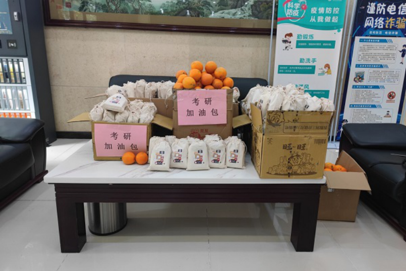 22号上午8:00,2018级辅导员陈晨老师和员工干部们早早便在在交通楼大厅准备好了考研加油包。一份份精美的福袋整齐地摆放其中,福袋里包括寓意马到成功的脐橙、寓意好事发生的柿子和花生形状的钥匙扣、寓意牛气冲天的旺仔牛奶等心意满满的小礼物,以及对考研学子较为实用的暖宝宝、巧克力和棒棒糖。
