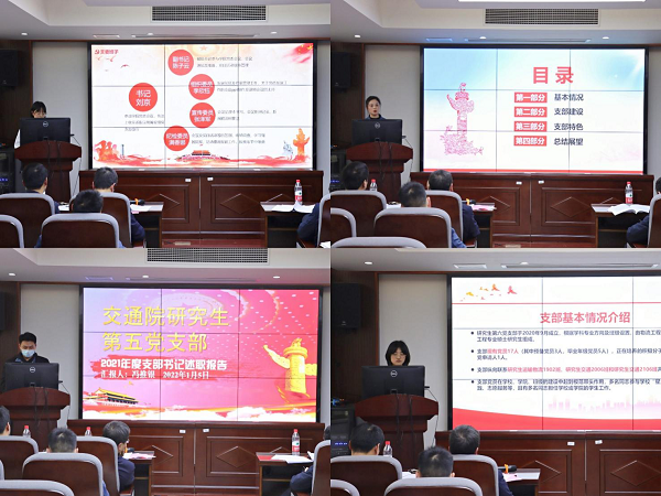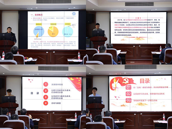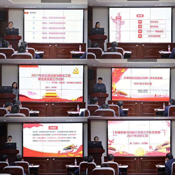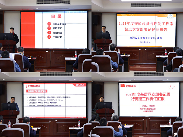 首先由各个支部书记就本年度支部和个人工作进行述职,最先进行汇报的是教职工党支部书记。交通运输系教工党支部、交通设备与控制工程系教工党支部、物流工程系教工党支部、高速列车研究中心教工党支部的4个支部书记分别从支部2021年的基本工作情况、书记的履职情况、教职工党员这一年的科研成果、支部的组织生活等方面都进行了详细介绍,同时也都指出了这一学年在支部建设中存在的问题,以及未来改进的方向。公司党委成员对四个教工党支部进行了点评,在支部建设、党史学习教育等方面都有所进步,但仍然存在先锋模范带头作用还发挥不够的问题,下一步要继续加强。对于高速列车研究中心党支部尤其提出要配合公司做好寒假期间的疫情防控工作。