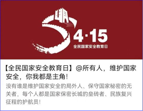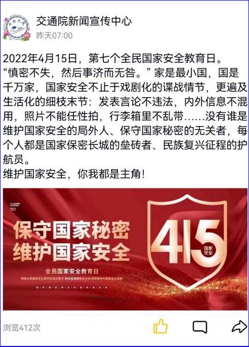 由交通院新闻宣传中心牵头,明确4月15日是第七个全民国家安全教育日,聚焦“树牢总体国家安全教育观,感悟新时代国家安全成就,为迎接党的二十大胜利召开营造良好氛围”的教育主题,普及相关知识,以图文结合的形式在公司官方QQ、微博同步更新动态,各班级官Q转发、跟评。