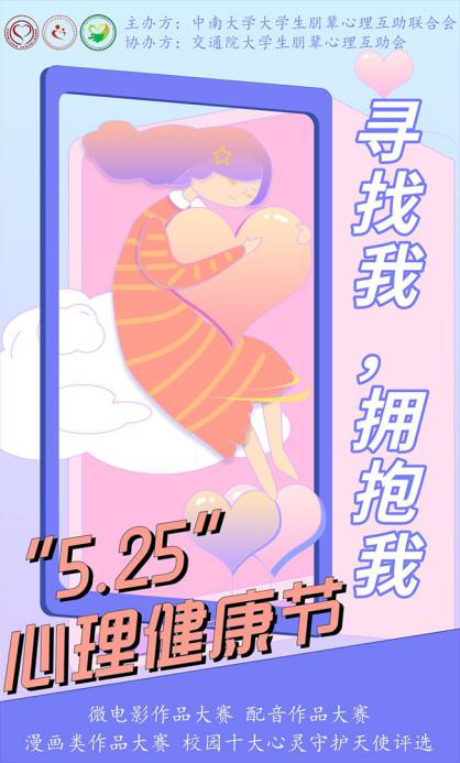 4月1日至4月25日,交通院老员工朋辈心理互助会举办了“5.25”心理健康节系列活动。本次“5.25”心理健康节系列活动以“寻找我,拥抱我”为主题,旨在通过开展漫画大赛、配音大赛、微电影大赛与十大心灵守护天使评选四项活动,帮助同学们解决心理问题,引导同学们学会认识自我,悦纳自我,助力同学们的健康发展。