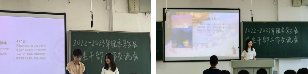 会议开始,主持人简要介绍了院团委、员工会的各部门设置和人员构成。接下来,各部门部长轮流发言,介绍各部门职能、部门成员、工作简介以及工作经验。各部门成员依次上台展示自己,书友沙龙协会副部长张万里还作诗一首,祝愿每一位同学可以轻松愉快地学习生活,大会在轻松愉悦的气氛中进行着。