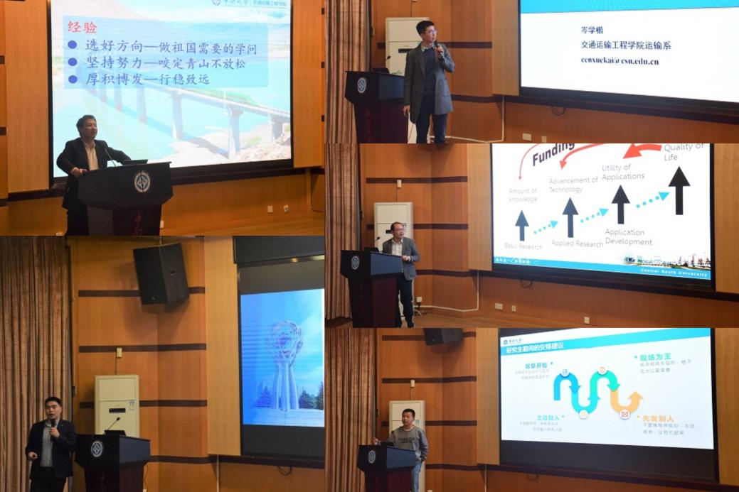 随后,公司各系所老师上台分享学术经验。成庶老师就不同研究方向的可能就业企业、用户单位及科研院所进行了讲解,并围绕“主动、合作、全局观、果敢”四个关键词谈论了自己的个人研究经验。易兵老师围绕高水平期刊推荐、学术科研经验分享、发展前景与就业方向等方面进行了分享,强调了阅读科技论文的三步法。岑学楷老师结合自身经历从期刊推荐、英文论文写作、留学深造与考研保研申博等方面进行了分享。李双琳老师结合物流工程的学科特色,分享了相关的中英文高水平期刊,并阐明了科研选题的顶层设计的内涵。王中钢老师从自身与铁路结缘的经历谈起,强调了要选择祖国需要的科研方向,有咬定青山不放松的坚持以及厚积薄发、行稳致远的态度。