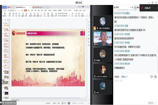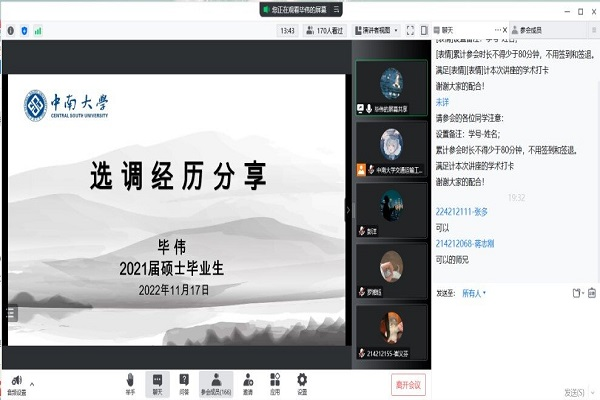 为加深同学们对选调备考的认识,正确把握选调生政策,提高冲刺阶段备考质量,11月17日晚19:30,“学习二十大,基层建功业”选调备考暨志愿服务经验交流分享会在线上顺利举行。本次活动由bv伟德国际研究生会主办,研究生第二、第四党支部联合协办,邀请2017级硕士研究生彭洋、2018级硕士研究生毕伟及优秀青年志愿者罗湘钰主讲。220余名同学通过线上平台积极参与活动,同学们在学习理论知识、汲取备考经验的同时,热烈讨论老员工应该如何参与志愿服务活动、力所能及服务社会。