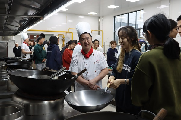 答疑结束后,所有参赛队伍在厨师长的带领下进入后厨进行观摩学习。三位厨师长现场烹饪菜肴,向参赛队伍演示了厨具、刀具、灶台的正确使用方法,菜品烹饪的规范操作以及菜品摆盘的创意设计,同时还强调了厨房消防安全知识以及烫伤、刀伤的紧急处理方法。同学们跃跃欲试,与厨师长们积极交流,现场氛围十分热烈。活动最后,在场全体成员合影留念。