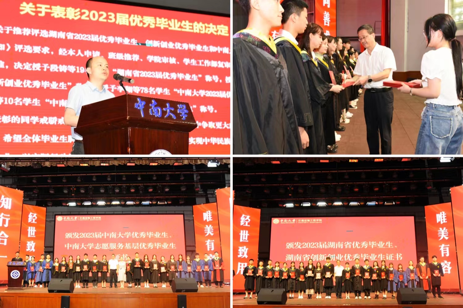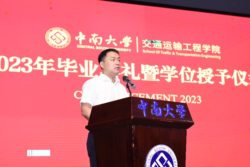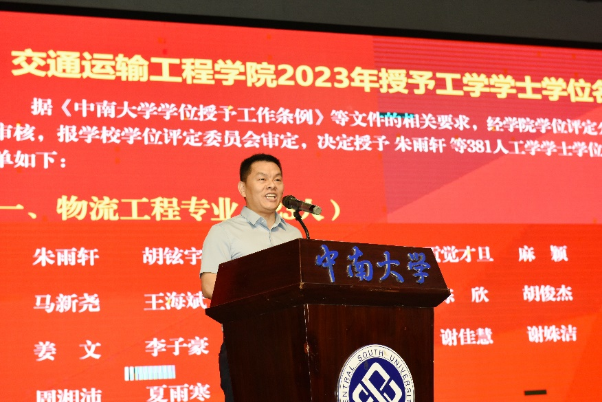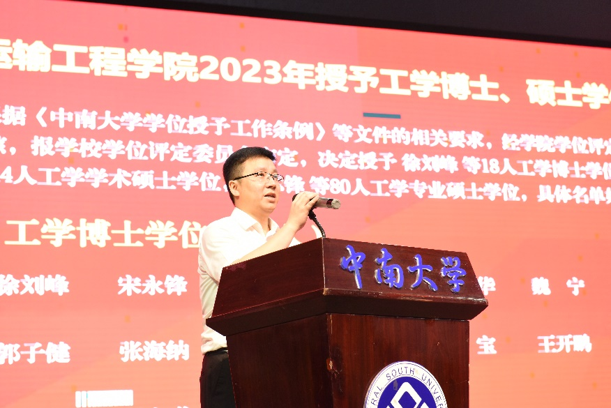 典礼在庄严的国歌声中开始。交通院副经理彭勇宣布2023年授予工学博士和硕士学位名单,副经理陈维亚宣布学士学位员工名单。在本届毕业生中,18人获工学博士学位、44人获学术硕士学位、85人获专业硕士学位、381人获工学学士学位。