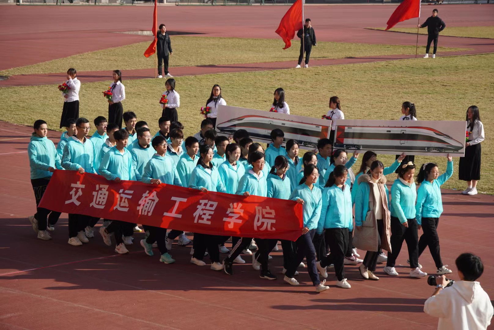 随着《运动员进行曲》在体育场内响起,各个公司的运动员方阵入场表演。踏着音乐的鼓点,bv伟德国际1946的运动员方阵迈步走来。红色旗帜迎风飘扬,运动员们统一着装,大步向前,展现出交院学子不畏困难、敢于挑战的风采;运动员手持展示中国高铁的方牌,彰显着交院学子对交通强国的不懈追求以及踔厉奋发、报效祖国的决心。