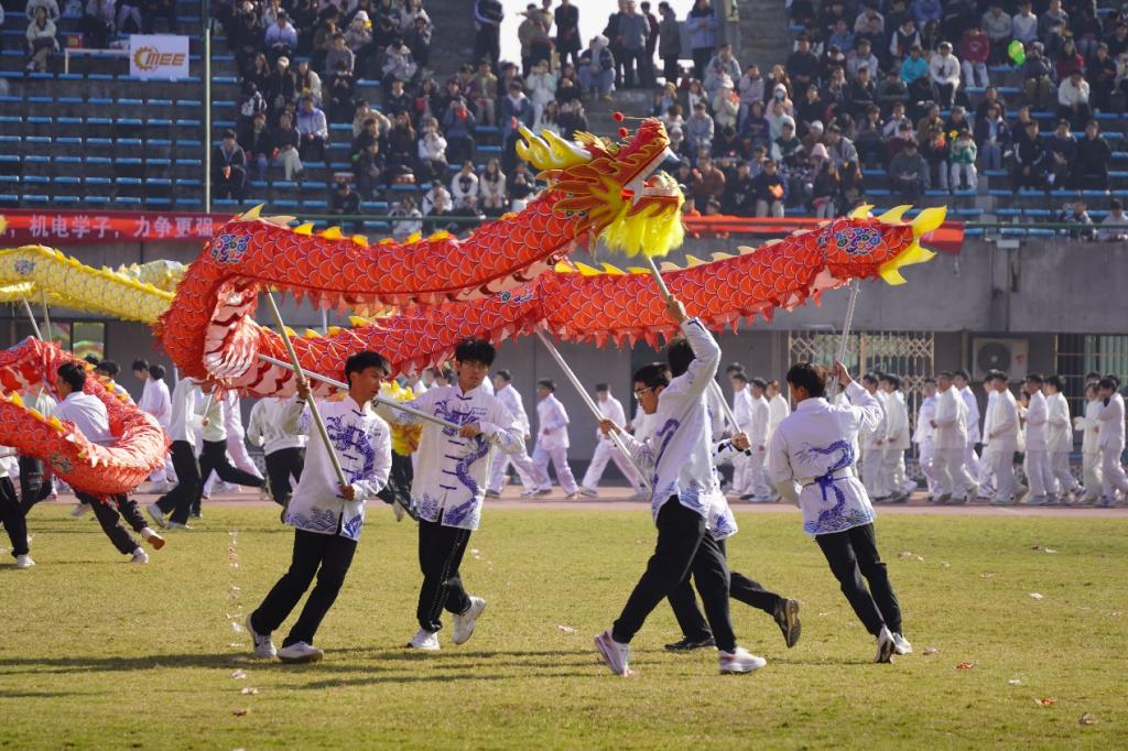 随后,舞龙舞狮队伍、太极拳方阵、由歌曲《大中国》和《一起向未来》串烧而成的舞蹈表演队伍轮番进入体育场内进行表演。其中,由九名意气风发的交院学子组成的交通院舞龙队为同学们展示了舞龙的艺术魅力,他们紧跟着龙头引导,根据鼓点和音乐节奏,有条不紊地让龙起伏腾跃、摇摆、翻滚、盘旋,展现出腾云驾雾、游龙戏水的神态。在整个表演过程中,他们眼神自信坚定,神采飞扬,笑容在阳光的照耀下尽显青春风采。